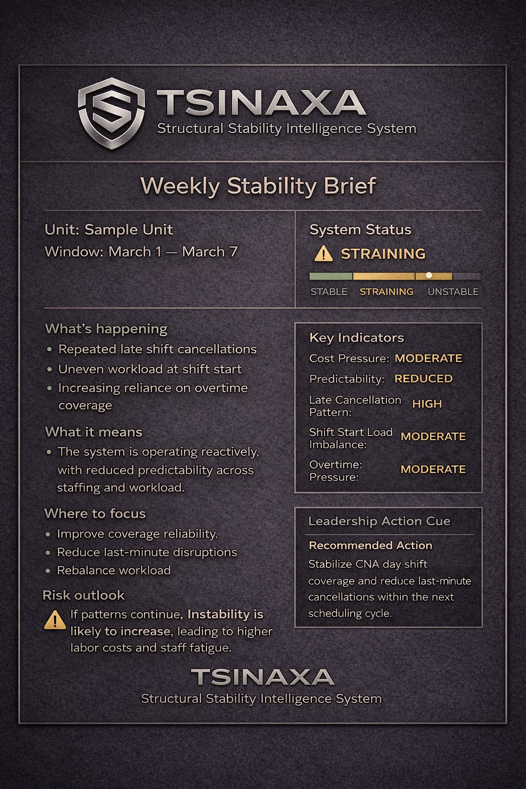 TSINAXA is a structural stability intelligence system that helps leaders improve predictability across staffing, flow, and workload—before disruption, cost pressure, and turnover escalate.